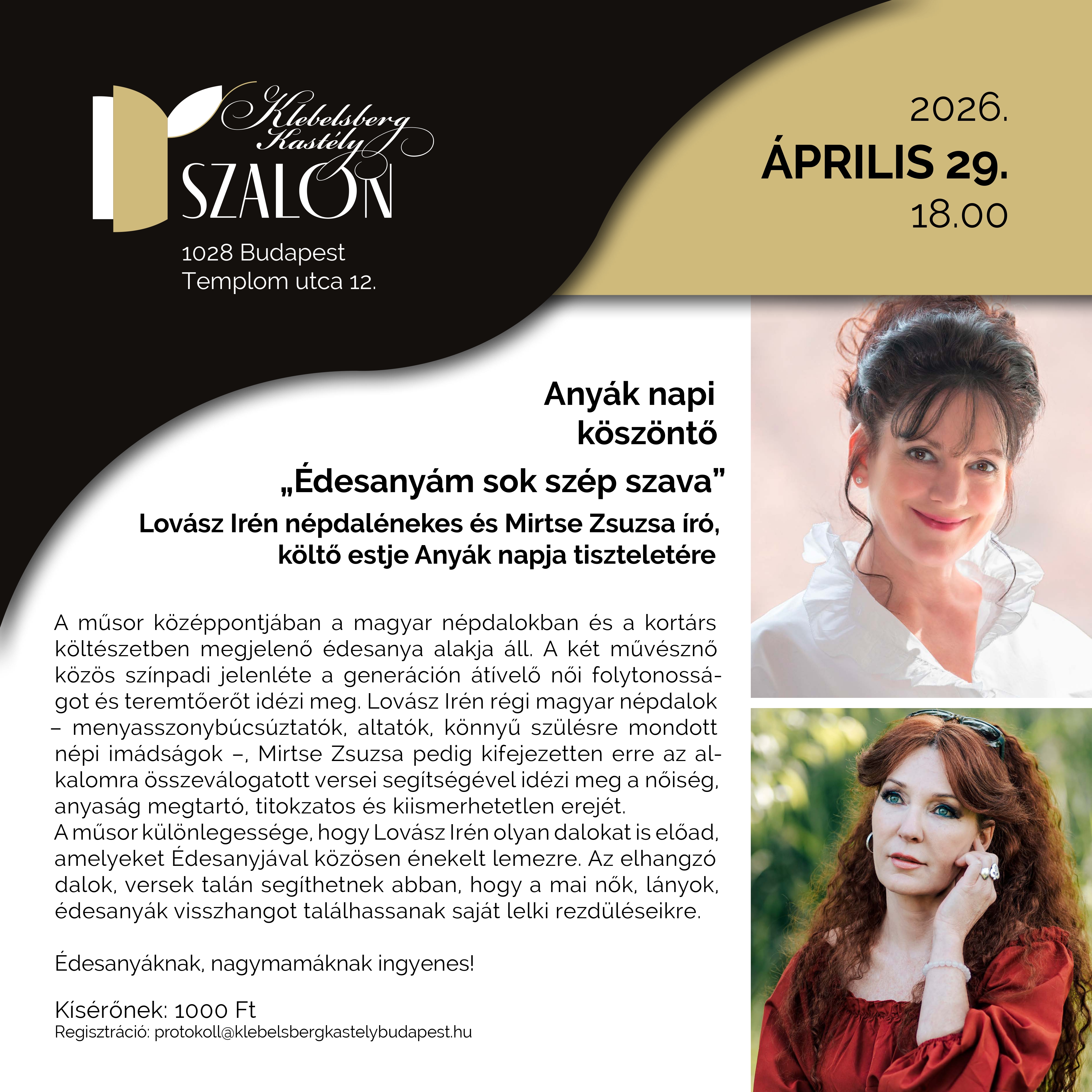 Lovász Irén és MIrtse Zsuzsa anyák napi műsora a Klebelsberg Kastély Szalonban, 2026. ápr.29.